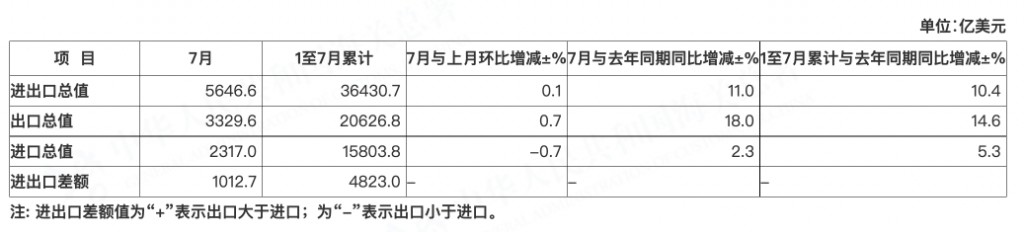 按美元計價,前 7 個月我國進出口總值 3.64 萬億美元,增長 10.4%。其中,出口 2.06 萬億美元,增長 14.6%;進口 1.58 萬億美元,增長 5.3%;貿易順差 4823 億美元,擴大 61.6%。