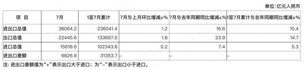8 月 7 日週日,海關總署發佈的數據顯示,7 月份,中國進出口總值 3.806 萬億元(人民幣,下同),同比增長 16.6%。其中,出口 2.24 萬億元,增長 23.9%;進口 1.56 萬億元,增長 7.4%。