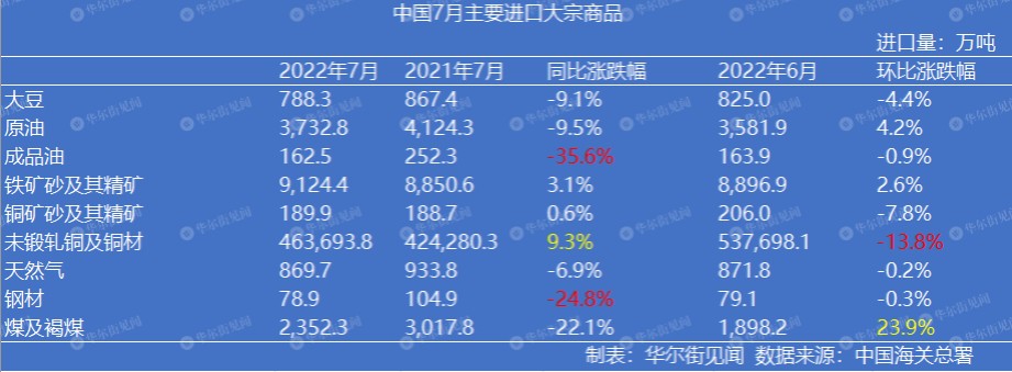 從今年前 7 個月的進口累計數據來看,主要進口大宗商品中,只有未鍛軋銅及銅材的進口量增加了 5.8%;而鐵礦砂、原油、煤炭和天然氣等進口量均有所減少。