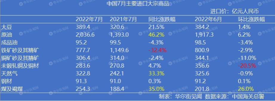 從進口值表中可以看出,今年 7 月份對比去年同期,原油、天然氣、煤炭和大豆的進口值大幅上漲,分別增加了 46.2%、33.3%、35% 和 21.5%。