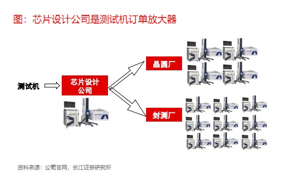 芯片設計公司會先與自己的客户進行芯片需求溝通交流來設計方案,同時也會採購少量的測試機,通過了這個環節後,才會驅動才下游代工廠和封裝廠進行採購。