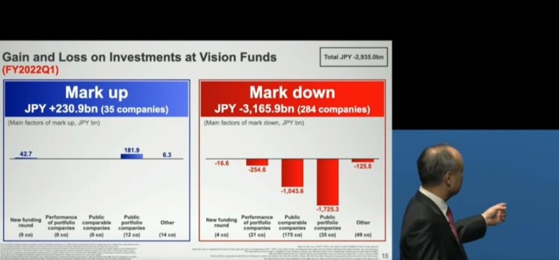 据孙正义介绍,在最近一个季度,软银在其投资组合中减记了 284 家公司,仅增持了 35 家公司。他还表示,软银正在严格限制新投资。