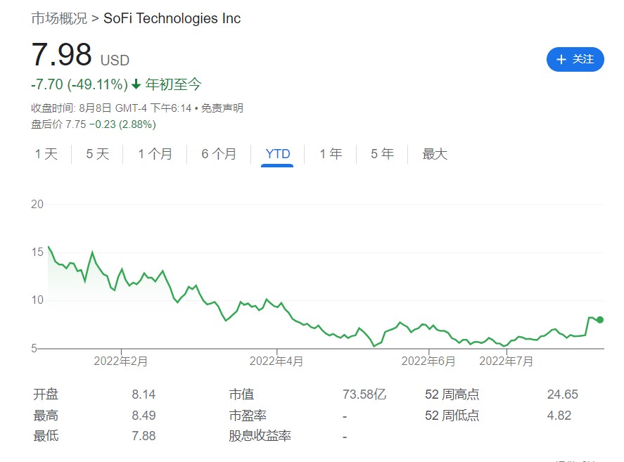 按照周一的收盘价来算,SoFi 今年以来股价已经累计下跌近 50%,软银抛售其股票的消息传出后,周一盘后公司股票一度跌 3.5%。