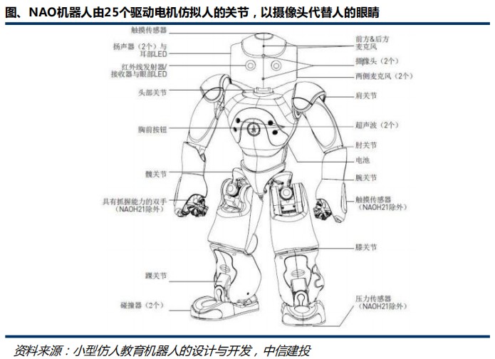 以中小型仿人機器人 NAO 為例,其共有 25 個驅動電機、2 個攝像頭、9 個觸摸傳感器、4 個定向麥克風、8 個壓力傳感器、2 套紅外接收器發生器以及聲吶測距儀等。