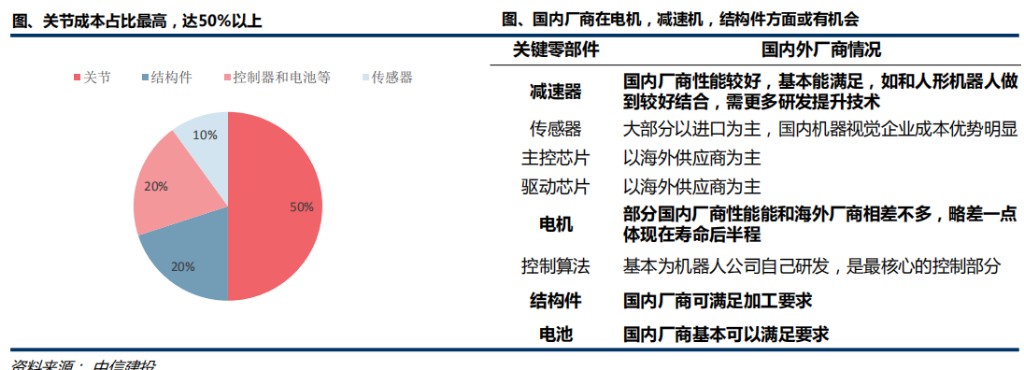 仿人機器人 50% 以上的成本來自於關節,如用電機驅動,一個關節使用一個電機,電機用量非常可觀,國內電機廠商在性能上與海外廠商差距不大。減速器方面,從性能上來看,部分國內廠商基本可以滿足。結構件成本佔比為 20% 左右,僅次於關節,需根據仿人機器人的設計進行定製化生產,作為傳統機加工技術,國內廠商可以滿足要求。