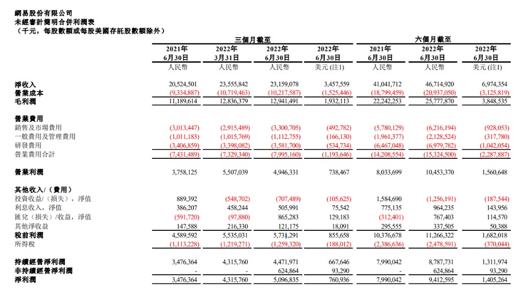 8 月 18 日港股盤後,網易公佈截至 2022 年 6 月 30 日的第二季度未經審計業績,業績要點如下: