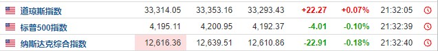 截止發稿,道瓊斯指數漲 0.07%,標普 500 跌 0.10%,納斯達克指數跌 0.18%。