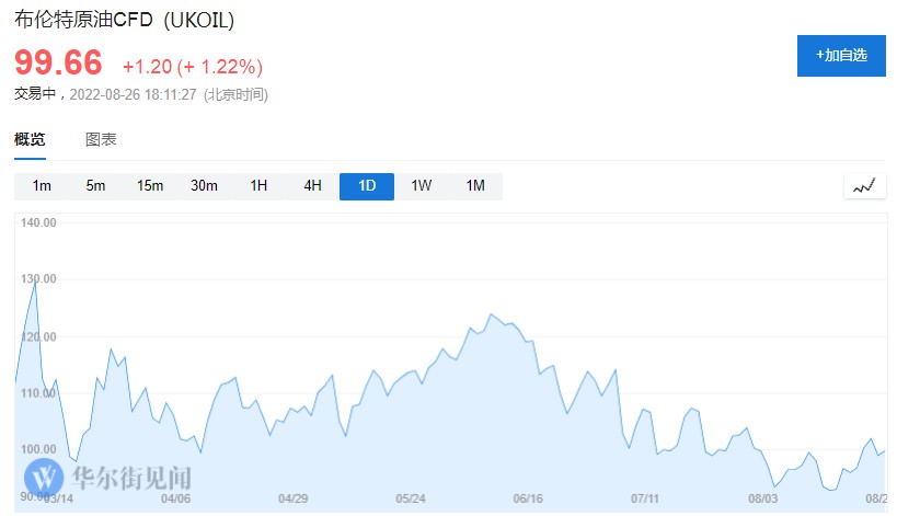 布倫特原油上漲 1.22%,報 99.66 美元/桶,黃金價格小幅下跌,比特幣跌至 21000 美元。