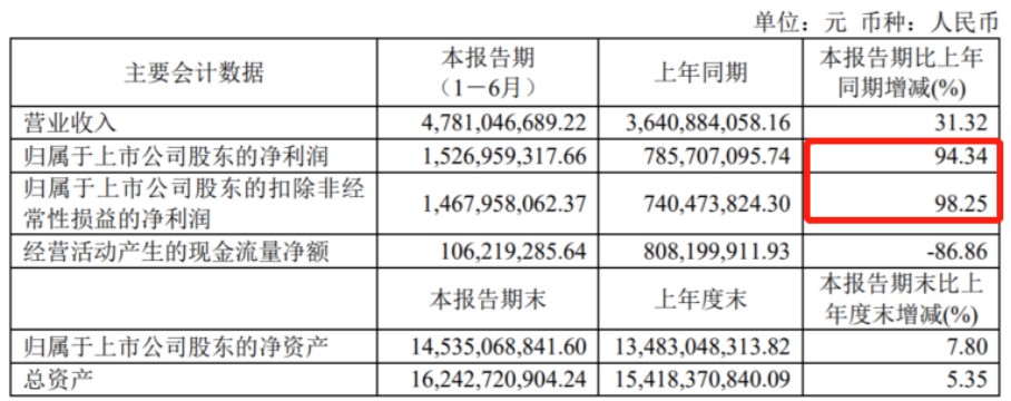 營業收入 47.81 億元,同比增長 31.32%;淨利潤 15.27 億元,同比增長 94.34%。
