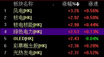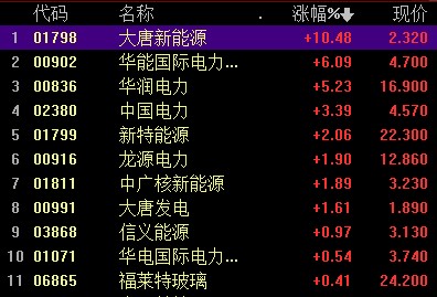 大唐新能源漲超 10%,華能國際電力股份漲超 6%,華潤電力漲超 5%,東方電氣漲超 4%,中國電力漲超 3%。