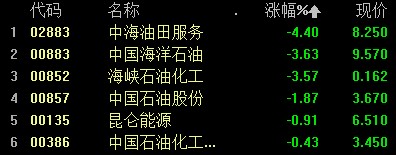 中海油田服務跌超 4%,中國海油石油跌近 4%,中國石油股份跌近 2%。