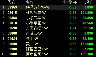 騰訊跌超 3%,理想汽車跌近 3%,小鵬汽車、小米集團、萬國數據跌超 2%,快手、美團、阿里、百度跟跌。