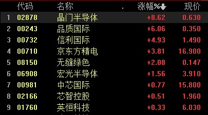 晶門半導體漲近 9%,上海復旦漲超 7%,宏光半導體漲近 2%,中芯國際漲近 1%。