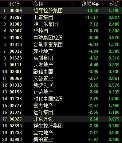 旭輝控股集團跌近 14%,雅居樂集團跌超 7%,碧桂園跌近 7%,合景泰富集團跌超 5%。