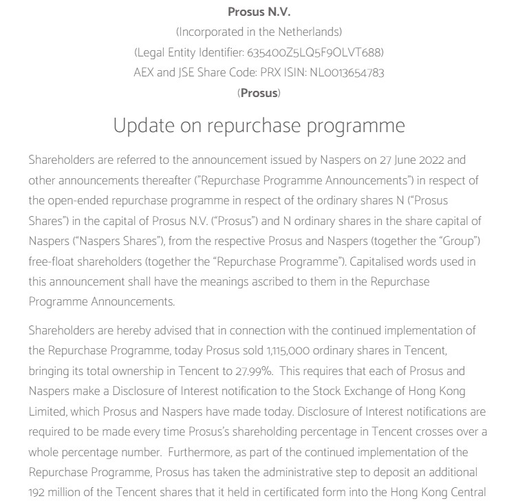 騰訊最大股東 Prosus 9 月 8 日發佈公告稱,為配合公司回購計劃的持續實施,出售 111.5 萬股騰訊普通股,持股比例降至 27.99%。