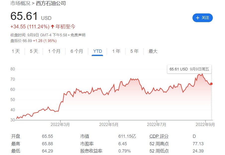 儘管最近油價有所回落,但此前一度觸及十四年高位,截至週五收盤,今年以來西方石油股價已經累計上漲了超過 110%。西方石油的股價週五收漲 1.58%,報 65.61 美元。