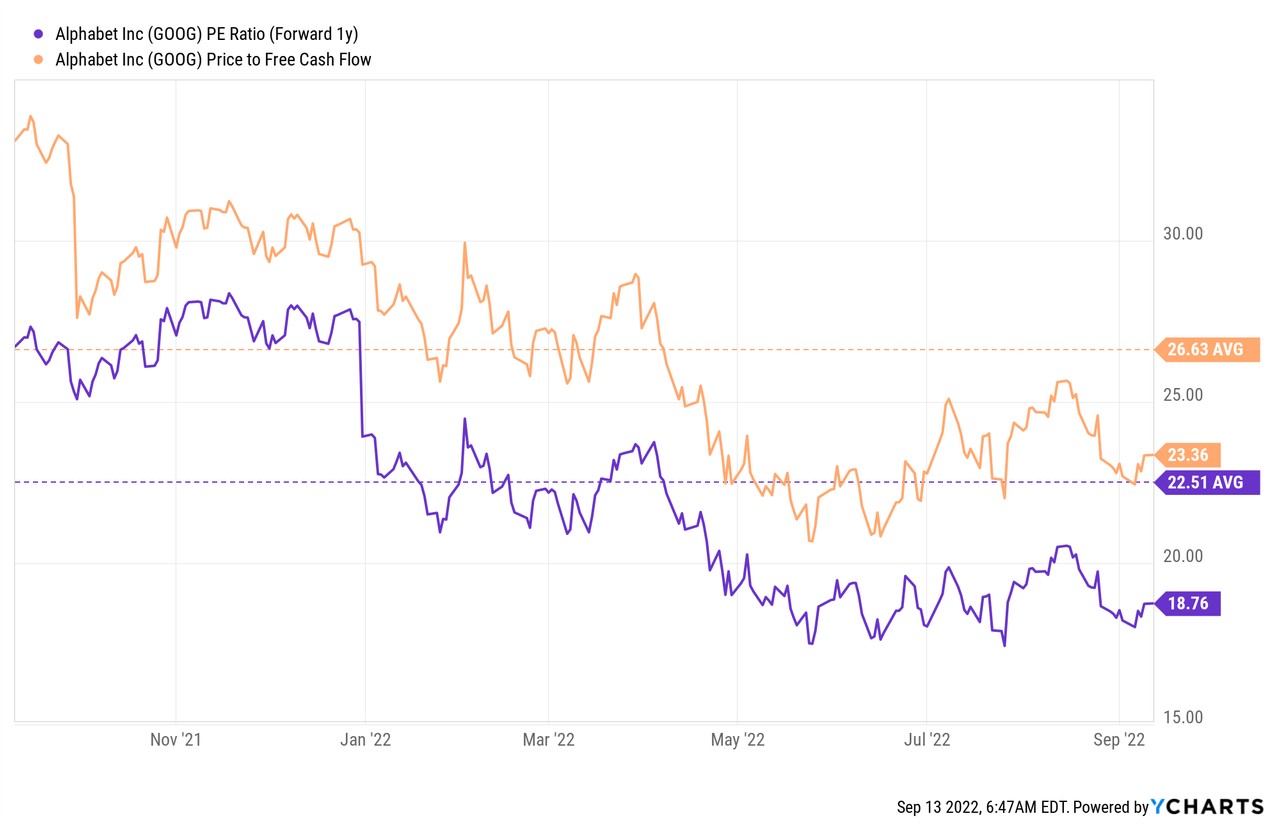 市場預計谷歌在 2023 財年的每股收益為 5.96 美元,市盈率為 18.8 倍。從盈利和自由現金流的角度看,谷歌的股價非常有吸引力,這兩個比率都低於 1 年平均水平 (如下圖虛線所示)。谷歌的低估值實際上可能推動了谷歌增加股票回購授權的決定。