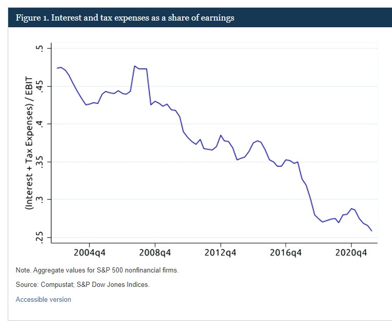 雖然企業槓桿率上升,企業利率的顯着下降也使利息支出佔收益的比例下降。