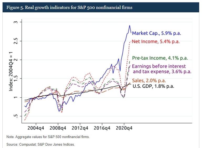 根據研究,從 2004 年第四季度到 2022 年第一季度,標普 500 指數非金融公司市值的年度實際增長率為 5.9%,淨利潤增長率為 5.4%。如果税收支出回升至原水平,淨利潤增長率降至 4.1%,如果利息和税收均回升至原水平,淨利潤增長率進一步降至 3.6%,與 5.4% 的水平相比下降了 1.8 個百分點。