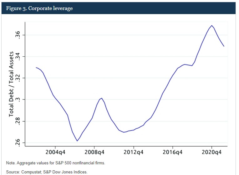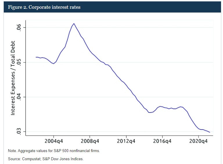 2007 年,金融危機爆發前,標準普爾 500 指數非金融公司面臨的利率(利息支出/總債務)保持在 6% 左右。到 2019 年底,在疫情爆發之前,企業利率已下降至約 3.5%,到 2022 年第一季度甚至進一步下降至 3%。