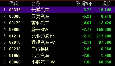 长城汽车跌近 6%,五菱汽车跌超 5%,吉利汽车跌超 4%,蔚来跌近 3%,比亚迪股份、理想汽车、广汽集团、北京汽车跌超 2%,小鹏汽车跌近 2%。