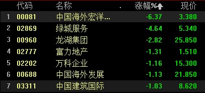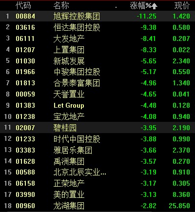 旭辉控股集团跌超 11%,恒达集团控股跌超 9%,大发地产、上置集团跌超 8%,新城发展跌超 5%,碧桂园等多股跌超 3%。绿城服务跌超 4%,龙湖集团跌近 3%,富力地产、万科企业等多股跌超 1%。