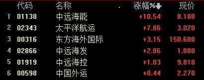 中远海能涨超 10%,太平洋航运涨近 8%,东方海外国际涨超 3%,中远海发涨近 3%。
