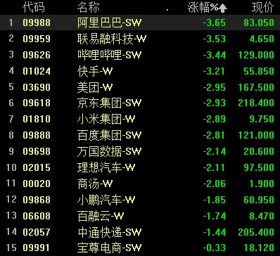 阿里巴巴、哔哩哔哩、快手跌超 3%,腾讯、美团、京东、小米、百度跌近 3%。