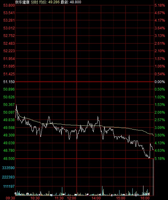 京东健康跌近 5%,消息面上,京东健康公告称,刘强东同意将于宿迁天宁持有的 45% 股权转让予京东集团副总裁缪钦。