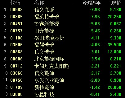 信义光能、福莱特玻璃跌近 8%,协鑫新能源、阳光能源爹查 5%,洛阳玻璃、福耀玻璃跌超 4%,信义玻璃、北京能源国际跌超 3%,新颖呢公园、水发兴业能源跌超 2%,新特能源跌超 1%。