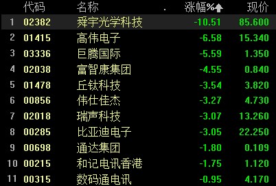 舜宇光学科技跌超 10%,高伟电子跌超 6%,富智康集团跌 4.5%,丘钛科技、瑞声科技跌超 3%。
