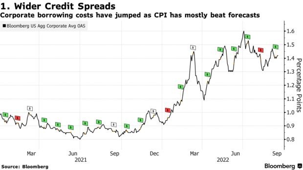 上週公佈的美國 8 月消費者價格指數 (CPI) 強於預期,鞏固了投資者們對美聯儲將於本週連續第三次加息 75 個基點的押注。除了通脹放緩之外,其他可能導致美聯儲收斂其強硬態度的潛在指標還包括信貸息差擴大、違約風險上升、債券市場流動性萎縮以及匯市動盪加劇。本文通過以下四張圖表對這些潛在指標進行更深入的分析。