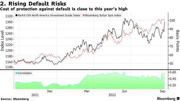 針對公司債務違約風險的保護成本激增同樣可能會嚇到美聯儲。Markit CDX 北美投資級指數 (Markit CDX North America Investment Grade Index) 是一籃子投資級債券信用違約掉期的基準,今年以來該指數的價差已經翻了一番,達到約 98 個基點,接近 6 月份創下的 2022 年 102 個基點的高點。違約風險的增加與美元升值密切相關,而美元升值得益於美聯儲加速加息的步伐。