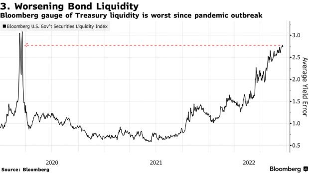 另一個可能促使美聯儲放慢緊縮步伐的威脅是國債流動性的萎縮。彭博的美國主權流動性指數接近自 2020 年初新冠疫情爆發以來的最糟糕水平。摩根大通測算的美國十年期國債的市場深度也降至 2020 年 3 月的水平,當時交易員們甚至都難以為流動性最強的政府債券找到價格。