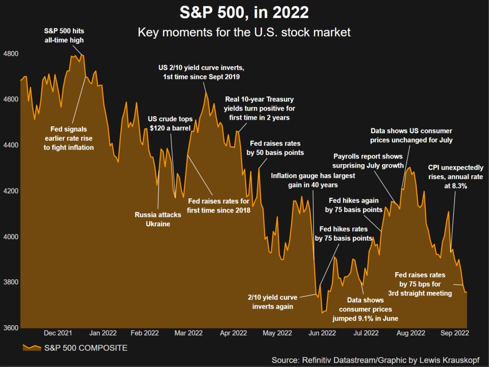 數據顯示,標普 500 指數今年以來下跌了 22% 以上。週五,標普 500 指數一度跌破 6 月中旬的收盤低點 3666 點,該指數在今年夏季的強勁漲幅已被悉數抹去。儘管近期數據顯示美國經濟相對強勁,但投資者擔心美聯儲的緊縮政策將導致經濟低迷。