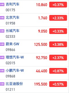 蔚來汽車漲超 3%, 理想汽車漲超 2%,小鵬汽車漲 0.8%。
