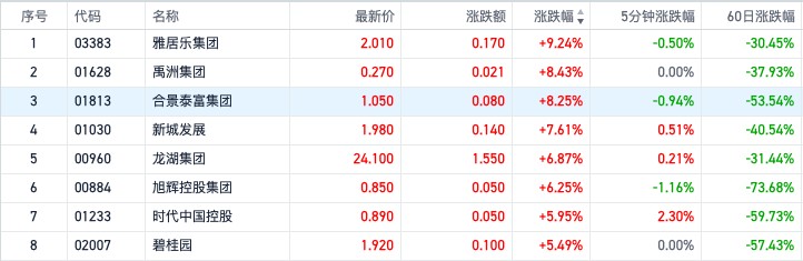 地產股和物業管理股走高,碧桂園服務漲 12%,旭輝控股集團漲 6%,合景泰富集團漲 5%,龍湖集團漲 6%。