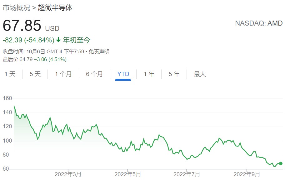 在 AMD 發出盈利警告後,其在美股盤後下跌約 4.5% 至 64.79 美元,而 AMD 今年迄今已經累計跌去了近 55%。