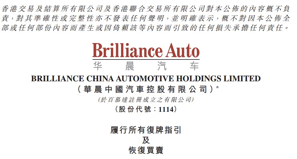 10 月 3 日,華晨中國發布公告稱,公司已履行所有復牌指引。在股份恢復買賣後,華晨中國將繼續與港交所合作,協助調查違反上市規則的情況。華晨中國表示,公司已整改導致暫停買賣的事宜。