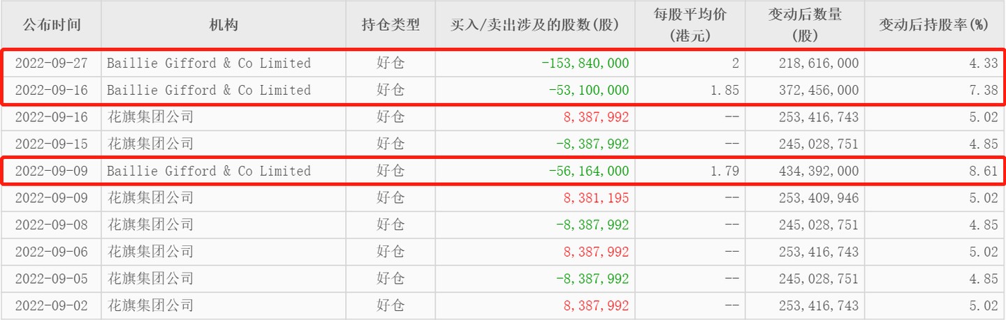 年內,華晨中國遭 BAILLIE GIFFORD & CO 三度減持。9 月 9 日、9 月 16 日、9 月 27 日,該公司分別減持華晨中國 5616.4 萬股、5310 萬股、1.54 億股。減持後,BAILLIE GIFFORD & CO 仍持有華晨中國 32.19 億股,持股比例由 8.61% 下降至 4.33%。