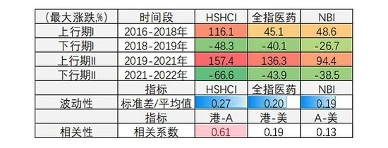 2016-2018 年、2019-2021 年上行期,港股醫藥的漲幅都比 A 股醫藥和美股生科更猛,2018-2019 年、2021-2022 年下行期,跌得也更狠。