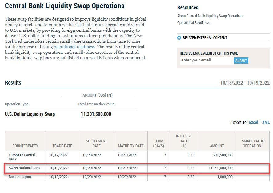 10 月 19 日週三,美國紐約聯儲官網的央行流動性互換操作紀錄顯示,美聯儲繼續對瑞士央行、歐洲央行和日本央行進行了合計 113 億美元的美元流動性互換操作。主要是為瑞士央行提供了 110.9 億美元的流動性。