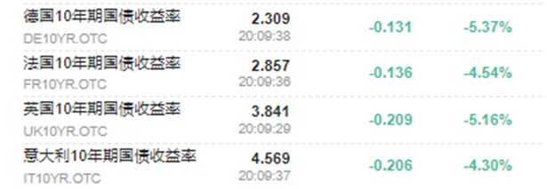 歐洲國債全線上漲,英國、意大利十年期國債收益率日內下行近 21 個基點,德國、法國 10 年期國債收益率日內下行 13 個基點。
