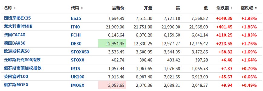 疲軟的 10 月 PMI 數據公佈後,歐股漲幅持續擴大。截至發稿,西班牙 IBEX 35 指數日內漲幅達 2%,意大利富時 MIB 指數漲 1.9%,法國 CAC40 指數日內漲 1.8%,德國 DAX 指數漲 1.8%,歐洲斯托克 50 指數漲 1.7%,歐洲斯托克 600 指數漲幅擴大至 1.6%。