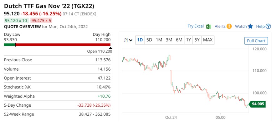 10 月 24 日週一,歐美股債雙雙走高,美元指數上行。在供應緩和以及温暖的冬季預期下,歐洲天然氣大跌 16%。
