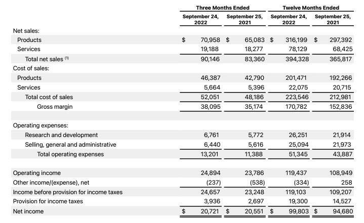 美東時間 27 日美股盤後,蘋果公佈 2022 財年第四財季財報:營業收入為 901.46 億美元,同比增長 8.14%;淨利潤為 207.21 億美元,同比增長 0.83%;毛利為 380.95 億美元,同比增長 8.3%。