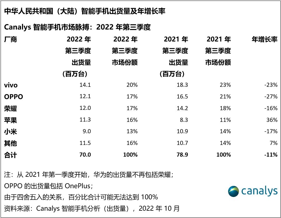 Canalys 發佈的數據顯示,2022 年第三季度,中國大陸智能手機市場出貨 7000 萬台,但市場仍然徘徊在低位,同比下跌 11%。其中,蘋果以 1130 萬台的出貨量位居第四。