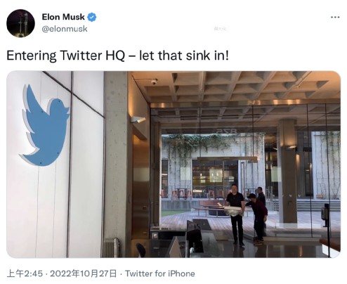 馬斯克當天在推特上發推,畫面顯示,他搬着一個水槽,邁着六親不認的步伐,走進了推特辦公大樓。