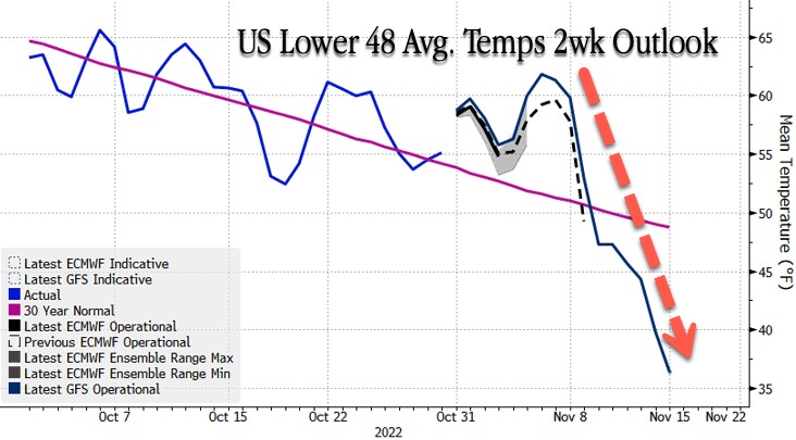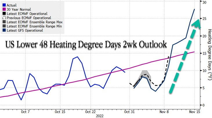 全美氣温低於 48 華氏度(約 8.9 攝氏度)的採暖天數將遠高於過去三十年的均線,這意味着隨着全美氣温驟降,家庭和企業的供暖需求將飆升。