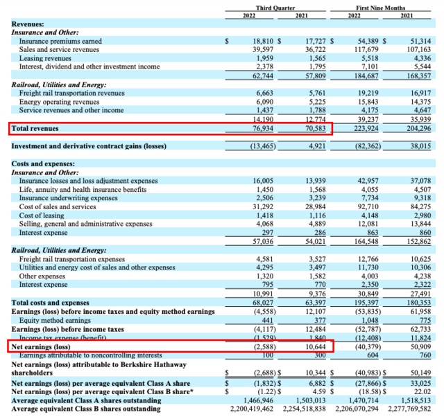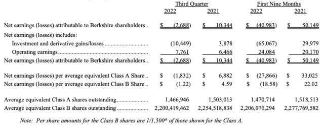 與二季度財報相似,主要由於投資和衍生品投資組合的虧損,伯克希爾第三季度歸屬於股東的淨虧損為 26.9 億美元,去年同期為盈利 103.4 億美元。第三季度每股 A 類普通股虧損 1832 美元,去年同期盈利 6882 美元。